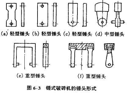 圖6-3中的(a),(b),(c)是輕型錘頭,質量通常為3.5一15kg,多用來破碎粒度為100-200mm的軟質相中等硬度物料,其中(a),(b)兩種兩端帶孔,磨損后可以調換4次使用,而(c)只能調換2次使用。圖6-3中的(d)為中型錘頭,質量為30-60kg,用來破碎800mm-1000mm的中等硬度物料。圖6-3中的(e),(f)是重型錘頭,質量達50-120kg,主要用來破碎大塊和堅硬物料。錘頭用高碳鋼鍛造或鑄造,也可用高錳鋼鑄造,為了提高耐磨性,采用高錳低合金鋼,有的在錘頭工作表面上涂焊上一層硬質合金。近來有的用高鉻鑄鐵錘頭復合鑄造,即錘柄采用ZG45鋼,而錘頭采用高鉻鑄鐵,而耐磨性比高錳鋼錘頭提高數(shù)倍。
