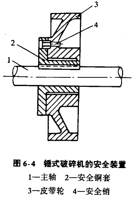 錘式破碎機的安全裝置如圖6-4所示。在破碎機的主軸上裝有安全銅套2,皮帶輪3套在銅套上,銅套與皮帶輪則用安全銷4連接,當破碎機內進入金屬物或過負荷時,安全銷即被剪斷而起保護作用。安全銷的材質應按規(guī)定或經(jīng)過實踐驗證,不能用強度過大的材料作安全銷,以防止進入金屬物后安全銷不斷裂,損壞其他零件和造成大的事故。