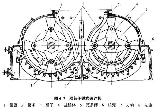 雙轉子捶式破碎機如圖6-7所示。在機殼6內,平行安裝有兩個轉子。轉子由臂形的掛錘體4及鉸接在其上的錘子3組成掛錘體安裝在方軸7上。錘子是多排式排列,相鄰的掛錘體互相交叉成十字形。兩轉子由單獨的電動機帶動作相向旋轉。