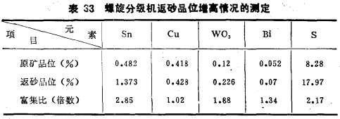 表33中列出某多金屬硫化礦在第一段磨礦分級機返砂中各種金屬礦物富集的情況。表33說明,磨碎錫石多金屬硫化礦時,各種金屬在分級機返砂中均有富集,尤以密度大的錫石、黑鎢礦更為突出,磁黃鐵礦也因粒度粗使富集比大。此外,對返砂中錫石的解離情況分析表明,其中游離的錫金屬率約占70%左右。性脆易碎的錫石,雖已基本單體解離,但還返入磨機藎復再磨,致使造成嚴重的錫石過磨及過粉碎。例如,某錫石硫化礦選廠的生產(chǎn)統(tǒng)計證明,第一段磨機由于磨礦分級循環(huán)中錫石高度富集所造成 錫金屬的過粉碎現(xiàn)象十分嚴重,過粉碎率約高達6~8%,即等于有6~8%的錫金屬因磨礦分級狀況不佳被損失了。