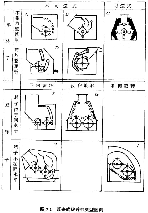 反擊式破碎機(jī)技其結(jié)構(gòu)特征,可分為單轉(zhuǎn)子和雙轉(zhuǎn)子兩種類(lèi)型,其詳細(xì)類(lèi)型見(jiàn)圖7-1。