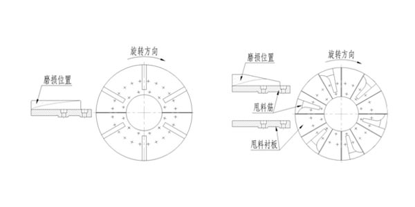 老型PFL的甩料盤(pán)結(jié)構(gòu)如圖1所示:由于甩料盤(pán)的筋靠近圓周邊緣的切線(xiàn)速度比內(nèi)側(cè)要高、磨損要快,材料利用率很低(不足10%),甩料盤(pán)筋的形狀和磨損位置如圖1所示。