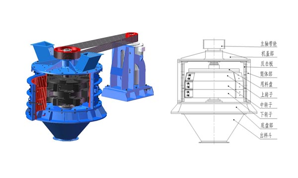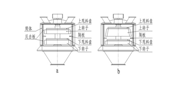 環(huán)形隔板或篦板的作用是:物料通過(guò)第一破碎腔破碎后,在環(huán)形隔板或篦板上自然形成堆積角,將物料導(dǎo)向下甩料盤(pán),使其二次加速重復(fù)上一級(jí)的破碎過(guò)程。由于筒體高度的局限性,使上、下轉(zhuǎn)子間距較小,環(huán)形隔板或篦板距上轉(zhuǎn)子錘頭太近,不但形不成自然堆積角,反而經(jīng)常引起堵料和上錘頭的過(guò)度磨損。