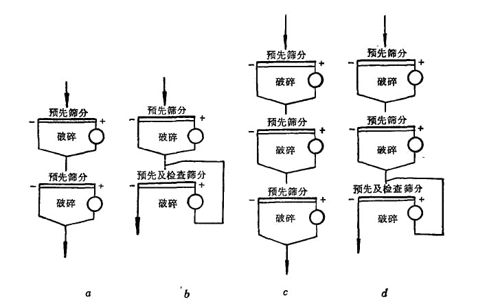 小型選礦廠常采用二段開路破種流程(圖1a),第一段一般可不設(shè)預(yù)先篩分。中小型選礦廠常用二段一次閉路破嬸流程(圖1b)成二段 —次閉路破碎流程(圖1d)。大型選礦廠常用三段開路破碎流程(圖lc)或三段一次閉路破碎她程(團1d)。在處理含水分較高的泥質(zhì)礦 石及易產(chǎn)生大量石英礦塵的礦石時,以采用開路破碎流程為宜,因采用閉路破碎時,易使篩網(wǎng)及破碎機堵塞,或產(chǎn)生很多有害礦塵。
