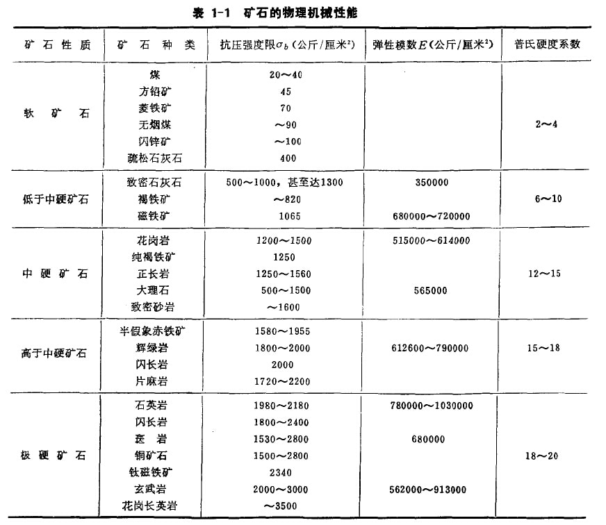 各種礦石的物理機(jī)械性質(zhì)見下表。