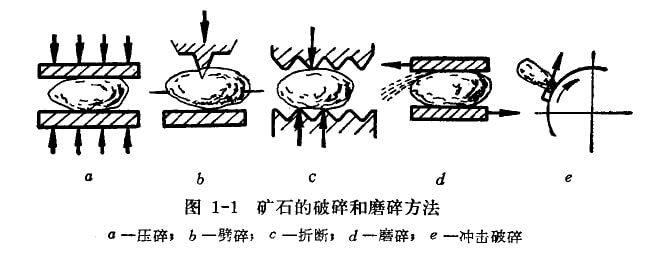 (4)磨碎(圖1—1d):礦石與運(yùn)動(dòng)的表面之間受一定的壓力和剪切力作用后,其剪應(yīng)力達(dá)到礦石的剪切強(qiáng)度限時(shí),礦石即被粉碎。磨碎的效率低,能量消耗大。