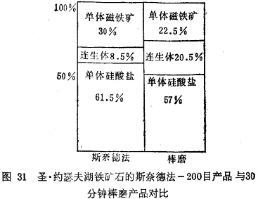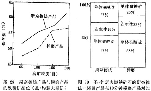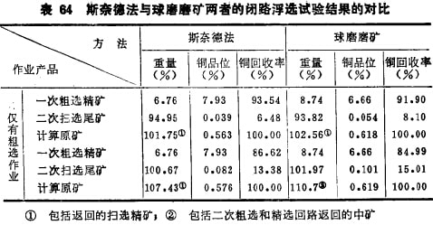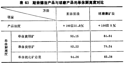 用磁鐵礦、斑巖銅礦、銅鎳礦、鋁釩土和石棉等作此方法的半工業(yè)性對比試驗(yàn)得出:破砟的產(chǎn)品比球磨或棒磨解離度髙,過粉碎輕,回收率和精礦品位都高于球磨或棒磨。圖29~31和表63 和表64列出了斯奈德法的產(chǎn)品單體解離度,精礦品位及回收率與棒磨及球磨的對比結(jié)果。可見,這種方法比較優(yōu)越,影響推廣應(yīng)用的主要障礙是快速閥門的磨損嚴(yán)重。