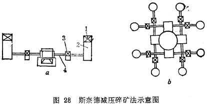 為了提高破碎效率,在改進(jìn)現(xiàn)有設(shè)備的同時(shí),還研究了破碎礦石的其他物理新方法,如電熱照射、液電效應(yīng)、熱力破碎、減壓破碎等。但是,這些方法多處于初期研究階段,只有A •斯奈德減壓碎礦法完成了半工業(yè)對比試驗(yàn)。