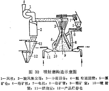 噴射磨礦機(jī)也是一種解離度髙及選擇性磨碎作用強(qiáng)的新型細(xì)磨機(jī),圖32是圓錐型氣流噴射式磨礦機(jī)的構(gòu)造示意圖。噴射式磨礦機(jī)的工作過程及原理主要是利用髙溫壓縮空氣(或過熱蒸汽或其它預(yù)熱氣體)作介質(zhì),當(dāng)壓縮空氣在燃燒室11預(yù)熱后,經(jīng)噴射管10的噴咀放出,因其突然減壓體積膨脹,以100~200m/s速度運(yùn)動的氣流,將來自給礦管8落下的5~3mm的被磨物料沿切線方向吹入圓錐形的磨礦室內(nèi),利用高速運(yùn)動著的礦粒間相互沖擊及磨剝即可達(dá)到自行碎裂。已粉碎的礦粒在分級設(shè)備的配合下進(jìn)行分級,其中合格產(chǎn)品被氣流帶入旋風(fēng)集塵器,粗顆粒則經(jīng)返回 管再度落入磨礦室的底部重新粉碎。