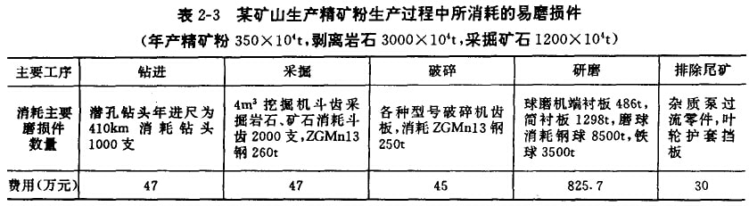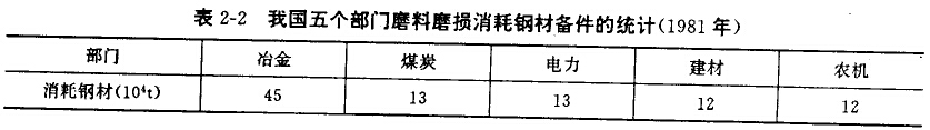 礦山機(jī)械,包括冶金礦山機(jī)械、煤礦機(jī)械、各類工程機(jī)械、建材機(jī)械、部分電力機(jī)械、農(nóng)業(yè)機(jī)械等所有機(jī)械中磨耗最嚴(yán)重的機(jī)械,也是設(shè)備備件消耗最多的部門。據(jù)1987年不完全統(tǒng)計(jì),上述部門備件耗費(fèi)鋼材近百萬(wàn)噸(見表2-2),耗費(fèi)資金幾十億元。下面我們僅以冶金礦山及煤炭礦山為例,看看礦山機(jī)械磨損失效的嚴(yán)重性。