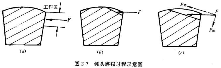 錘頭打擊物料的區(qū)域?yàn)楣ぷ髅?見(jiàn)圖2-7a),隨工作面不斷被磨損工作面將發(fā)生(圖2-7b,c所示)變化,物料對(duì)錘頭的磨損方式也將發(fā)生變化,初期錘頭以被撞擊受力方式為主,當(dāng)被磨損到一定程度時(shí),物料將對(duì)錘頭工作面及瑞頭產(chǎn)生沖刷作用。當(dāng)錘頭磨到一定尺寸后由于工作效率低,破碎物料粒度過(guò)大,就需更換錘頭了。