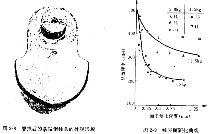 磨損失效后的高錳鋼錘頭見(jiàn)圖2-8。高錳鋼具有表麗加工硬化特性。當(dāng)受到物料幢擊時(shí)。恢錘頭表面產(chǎn)生撿洛吭們出現(xiàn)加工硬化層。高錳鋼耐磨性好壞,主要決定于加工硬化層的深度和硬度,圖2-9是5.8kg錘頭和11.5kg錘殘?bào)w加工硬化曲線。由圖2-9可知,兩種錘頭的加工硬化效果很差,尤其是5.8kg錘頭,其最高加工硬度僅HM530,且加工硬化層不到0.5mm?梢哉J(rèn)為這種上況條件下高錳鋼錘頭磨損屬于低沖擊磨料磨損,是造成高錳鋼錘頭耐磨性差的主要原因。