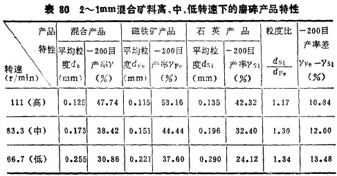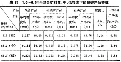當(dāng)磨機(jī)結(jié)構(gòu)參數(shù)一定時(shí),磨機(jī)內(nèi)鋼球的運(yùn)動(dòng)狀態(tài)將完全取決于磨機(jī)的轉(zhuǎn)速及介質(zhì)的充填率;而當(dāng)介質(zhì)充填率一定時(shí),在一定范圍內(nèi)隨著轉(zhuǎn)速的增加鋼球上升高度增大,鋼球的打擊力增強(qiáng),同時(shí),鋼球的相對(duì)運(yùn)動(dòng)速度也增大。破碎力大,破碎效率提高,但破碎的選擇性降低。為了說明轉(zhuǎn)速的影響,現(xiàn)選用2~lmm、1~0.5mm和0.5~0.3mm三組不同粒級(jí)的磁鐵礦與石英混合物(各占50%)作髙、中、低三種轉(zhuǎn)速的磨碎考查,結(jié)果列于表80~82。三種轉(zhuǎn)速是:一種為超臨界轉(zhuǎn)速(lllr/min,試驗(yàn)?zāi)C(jī)臨界轉(zhuǎn)速為l00r/min);中等轉(zhuǎn)速為"最適宜的轉(zhuǎn)速"(83.3r/min);低轉(zhuǎn)速為轉(zhuǎn)速率76%以下(66.7r/min)。
