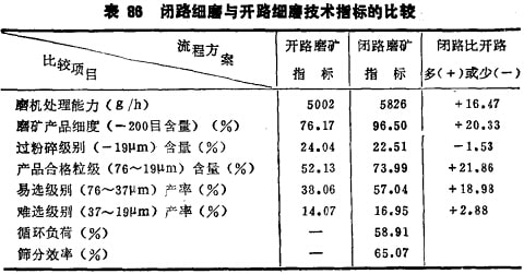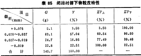 為了說明閉路磨礦的優(yōu)越性及選擇性保護有用礦物少遭過粉碎,現(xiàn)舉一組閉路磨礦的試驗結果如下:試驗為磨機與濕式細篩 閉路,篩孔為200目,表83、84及85分別為閉路時磨機排礦、篩上物及篩下物粒度特性。表86則為閉路細磨與開路細磨技術指標的比較。