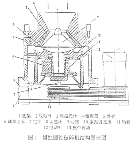 慣性圓錐破碎機(jī)的結(jié)構(gòu)如圖1所示。它的機(jī)體座落在隔振裝置上,工作機(jī)構(gòu)由定諧錐和動(dòng)錐組成,錐體上均附有耐磨襯板,襯板之間的空間形成破碎胺。動(dòng)錐軸插入軸套中,電動(dòng)機(jī)的旋轉(zhuǎn)運(yùn)動(dòng)通過(guò)傳動(dòng)機(jī)構(gòu)傳給固定在軸套上的激振器,激振器旋轉(zhuǎn)時(shí)產(chǎn)生慣性力,使動(dòng)錐繞球面支承的球心做旋擺運(yùn)動(dòng),動(dòng)錐與傳動(dòng)機(jī)構(gòu)之間無(wú)剛性聯(lián)接。當(dāng)破碎腔內(nèi)無(wú)物料時(shí),動(dòng)錐將沿定錐內(nèi)表面滾動(dòng)。當(dāng)破碎腔內(nèi)有物料時(shí),動(dòng)錐將沿料層滾動(dòng),在滾動(dòng)的同時(shí)隨物抖層厚度的變比伴隨有強(qiáng)烈脈動(dòng)沖擊,從而對(duì)物抖進(jìn)行破碎。