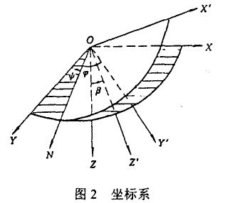 動(dòng)錐與電機(jī)之間無(wú)剛性聯(lián)接,繞球面支承的球心O做旋擺運(yùn)動(dòng),動(dòng)錐相對(duì)于機(jī)體的運(yùn)動(dòng)力剛體繞定點(diǎn)O的轉(zhuǎn)動(dòng)。以O(shè)點(diǎn)為原點(diǎn),機(jī)體中心線為Z軸建立坐標(biāo)系OXYZ,另取以動(dòng)錐軸線為Z′軸并與動(dòng)錐固結(jié)的動(dòng)坐標(biāo)系OX′Y′Z′,如圖2所示。動(dòng)坐標(biāo)平面OX′Y′與定坐標(biāo)平面OXY的交線用ON表示,稱為節(jié)線,節(jié)線垂直于OZ和OZ′,節(jié)線與定軸OY間的夾角ψ稱為進(jìn)動(dòng)角,節(jié)線與動(dòng)錐OY′間的夾角φ稱為自轉(zhuǎn)角,動(dòng)錐OZ′與定軸OZ間的夾角β稱為章動(dòng)角,根據(jù)運(yùn)動(dòng)學(xué)原理,繞O運(yùn)動(dòng)的動(dòng)錐相對(duì)于機(jī)體的位置用這三個(gè)角可以完全確定,因此,動(dòng)錐相對(duì)于機(jī)體的運(yùn)動(dòng)是由以下三種旋轉(zhuǎn)運(yùn)動(dòng)組成。