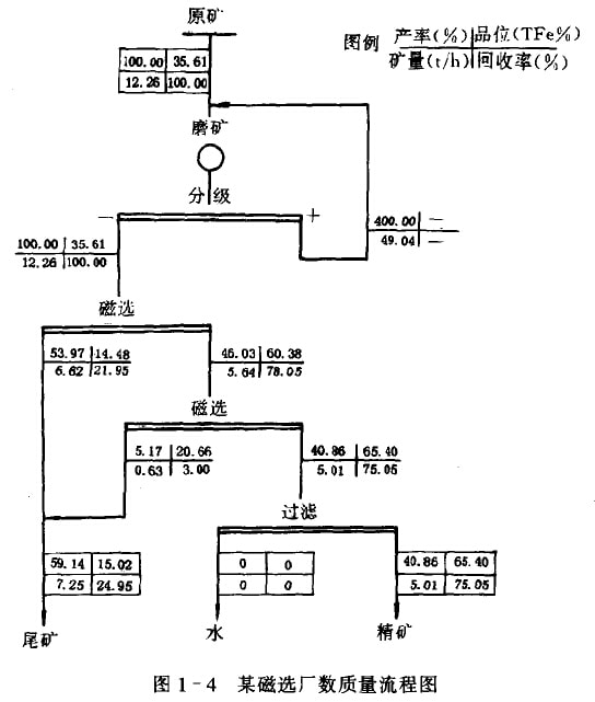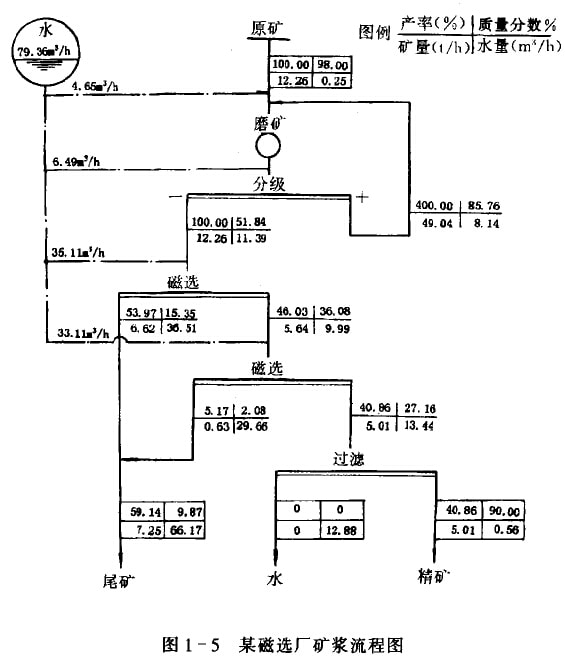 如果在線(xiàn)流程因上把各產(chǎn)物(包括原礦和中間產(chǎn)物)的礦量、質(zhì)量分?jǐn)?shù)、水量和各作業(yè)的補(bǔ)加水量均標(biāo)出來(lái),則稱(chēng)為礦漿流程圖,如圖1-5所示。通過(guò)此圖可了解各作業(yè)及產(chǎn)物的質(zhì)量分?jǐn)?shù)和耗水量,也是指導(dǎo)生產(chǎn)的依據(jù)之一。