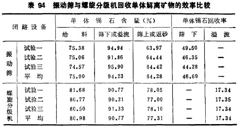 眾所周知,螺旋分級機的分級效率不高,一般按分離粒度計算的分級效率只有30?50%或60%左右。如果采用各類振動篩進行分級,篩分效率可達70%以上。細粒分級時若采用水力旋流 器,分級效率一般可達60?80%或80?90%;采用細篩進行篩分 時,超聲波細篩的篩分效率可高達90?95%,筏瑞克細篩的篩分 效率也可達到70?80%,效率均比水力旋流器高;⌒魏Y及平面細篩的篩分效率雖然較低,但有利于對脆性大密度礦物的及時排 出。如果按單體有用礦物(回收的目的礦物)的分布來計算分級 效率,則細篩的分離效率將顯著高于水力分級設備。例如前述的 周邊排料磨機與0.3mm篩孔的濕式振動篩組成閉路,按礦石粒級計的篩分效率77.19%,如果按磁鐵礦分布計算則效率為79.00%; 而在水力分級設備中,由于大量大密度細粒沉入返砂,所以按磁鐵礦分布計算的分離效率顯著變差。前述的中心排料磨機與螺旋分級機閉路,按礦石粒級計的分級效率為50.82%,但按磁鐵礦分布計的分離效率則只有34.35%。表94列出了試驗振動篩與螺旋分級機分離單體大密度礦物的分離效率,可見,篩子比螺旋分級機高出約一倍左右。
