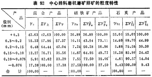 性脆易碎的大密度礦物在磨礦過松中本身就容易過磨及過粉碎,如果磨機是與水力分級設備組成閉路,則由下大密度礦物沉落速度快易在沉砂中富集,沉砂返冋磨機再磨便使大密度礦物再次遭受磨碎,這就加重其過磨及粉碎,結(jié)果在磨機排礦中使大密度脆性礦物的粒度比其他脈石礦物細得多,表93中列出了中心排料球磨機與螺旋分級機閉路磨碎磁鐵礦及石英混合料(各占50%)時磨機排礦產(chǎn)品的粒度特性。