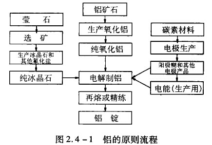 自1886年在冰晶石熔體中電解氧化鋁的方法實(shí)驗(yàn)成功后,此法一直是生產(chǎn)金屬鋁的唯一方法。它包括從鋁礦石生產(chǎn)氧化鋁以及氧化鋁電解兩個(gè)主要過程,F(xiàn)代生產(chǎn)鋁的原則流程如圖2.4-1所示。