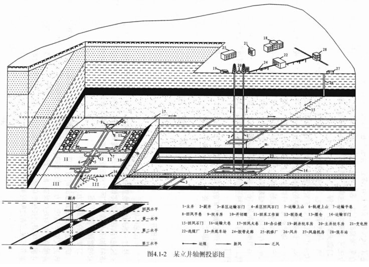 圖4.1-2是某礦井(立井)生產(chǎn)過(guò)程的軸側(cè)投影圖。從圖中可以看出,該礦井開(kāi)采三個(gè)煤層。為了開(kāi)采和運(yùn)輸煤炭,需要開(kāi)掘的井巷有:主井、副井、并底車(chē)場(chǎng)、石門(mén)、運(yùn)輸大巷、回風(fēng)大巷、采區(qū)上山、煤倉(cāng)、運(yùn)輸平巷、回風(fēng)平巷,回來(lái)工作面等。從井下提運(yùn)到地面的煤,需要經(jīng)過(guò)加工后裝車(chē)外運(yùn),故還需要在地面工業(yè)場(chǎng)地布置主副井井架、浴室燈房聯(lián)合建筑、皮帶走廊、選煤廠、機(jī)修廠、辦公樓等地面建構(gòu)筑物。