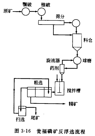 甕福磷礦脈石主要為白云石,采用反浮選工藝,從P2O528%-30%選到35%。如圖3-16所示,原礦被汽錘粉碎到1000 mm以下,再分別經(jīng)顎式破碎機(jī)與圓錐破碎機(jī)粗碎和中碎到18mm,經(jīng)閉路篩分后細(xì)碎到12mm,通過(guò)球磨機(jī),球磨機(jī)出來(lái)的漿料經(jīng)旋流器分離,組粉送回球磨機(jī)的入口重磨,形成閉合回路,最后獲得60%通過(guò)200目。加藥攪拌后進(jìn)入浮選機(jī),經(jīng)三級(jí)級(jí)選、一次掃選可得桔礦,用管路輸送到化工廠。由于改進(jìn)了藥劑,選別較為徹底,可不需要掃選,而將原有掃選用的浮選機(jī)串聯(lián)使用,以增加產(chǎn)量。