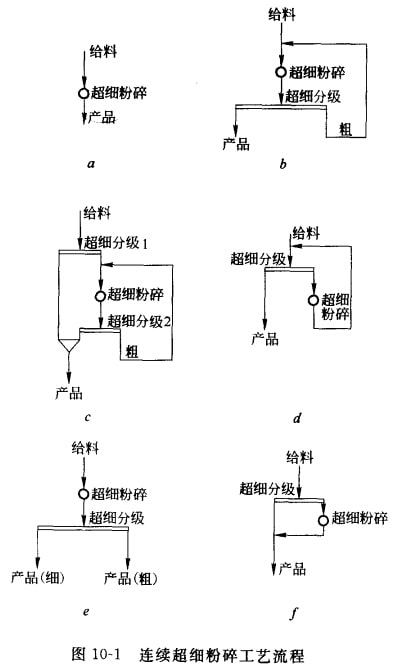 連續(xù)系統(tǒng)分為開路和閉路系統(tǒng),其主要區(qū)別在于其是否有分級機配套形成閉路。圖10-1所示為各種連續(xù)超細粉碎工藝流程。
