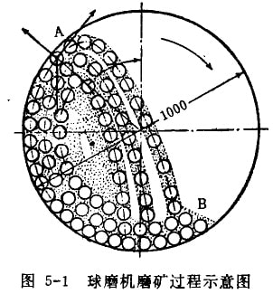 磨碎礦石通常是在磨礦機(jī)中進(jìn)行的。磨礦機(jī)有各種不同的型式,仍在磨碎有色金屬及黑色金屬礦石時(shí),目前我國只用球磨機(jī)和棒磨機(jī)。球磨機(jī)和棒磨機(jī)是一個(gè)兩端具有空軸的回轉(zhuǎn)圓筒,筒內(nèi)裝入相當(dāng)數(shù)量的鋼球或鋼棒。礦石和水從一端的中空軸給入圓筒,從另一端的中空軸排山。當(dāng)圓筒按規(guī)定的速度回轉(zhuǎn)時(shí),磨礦介質(zhì)(鋼球、鋼棒)在筒內(nèi)可作拋落運(yùn)動和滑動,使礦石受到?jīng)_擊和磨剝作用而被磨碎。磨碎了的礦石與水形成礦漿(濕式磨礦),由排礦端的中空軸排出。磨礦機(jī)磨礦過程中鋼球的運(yùn)動情況如圖5-1所示。
