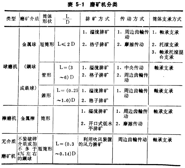 磨礦機(jī)通常根據(jù)磨碎介質(zhì)、機(jī)殼形狀和排礦方法進(jìn)行分類。一般分類如表5-1所列。