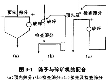 篩分是將礦石按粒度分成二種或多種級別的過程。篩分時,通過篩孔的顆粒稱為篩下產(chǎn)品;未涌過篩孔的顆粒稱為篩上產(chǎn)品。在選礦廠采用的篩分作業(yè)有預(yù)先篩分和檢查篩分兩種。預(yù)先篩分是礦石進(jìn)入破碎機(jī)前的篩分。其目的是除去粒度已合格的產(chǎn)品,防止物料的過破碎和提高破碎機(jī)的生產(chǎn)能力。檢查篩分是礦石經(jīng)破碎后進(jìn)行的篩分。為了控制破碎產(chǎn)品的粒度,使不合格的產(chǎn)品返回破碎機(jī)再破碎,見圖3-1。