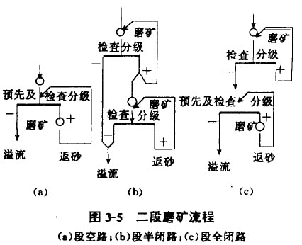 磨礦分干磨和濕磨兩種。生產(chǎn)實(shí)際中以濕磨為主。磨礦作業(yè)一般分兩段進(jìn)行,見圖3-5。第一段將給的12-20mm礦磨至0.3-0.2mm。第二段磨礦粒度為0.1-0.074mm。磨礦機(jī)一般與分級機(jī)組成閉路進(jìn)行工作。
