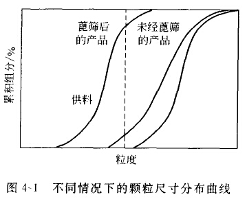 從圖4-1中可以看出供料以及產(chǎn)品的順粒尺寸分布曲線都是典型的“S”形。破碎過程中轉(zhuǎn)無英篩以限創(chuàng)出料的最大尺寸,則一些具有最大尺寸部分的物料在尺寸并未減小的情況下通過破碎系統(tǒng)是完全訂可能的。而從整體上講,大部分顆粒的尺寸都減小了,這就使得該產(chǎn)品的PSD為一更寬的分布。如果系統(tǒng)中設(shè)有篦篩,則產(chǎn)品的PSD曲線明顯左移。然而,由于原物料和破碎后的廢物的形狀不規(guī)則,一些大于篦篩開孔尺寸的顆粒,從對角位置或以一端向下的形式而透篩的情況時有發(fā)生,因此,篦篩產(chǎn)品的PSD曲線的一段要超過篦篩尺寸。