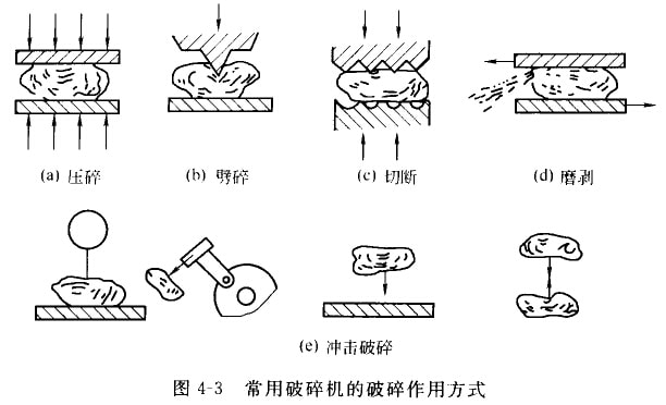 目前廣泛采用的破碎方法有沖擊破碎、剪切破碎、擠壓破碎摩擦破碎等,此外還有專用的低溫破碎、濕式破碎。常用破碎機的破碎作用方式如圖4-3所示。