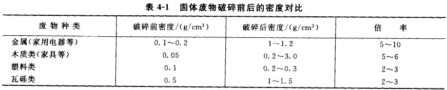 廢物經(jīng)錘式破碎機(jī)破碎以后,由于尺寸減小而密度增加。幾種固體廢物破碎前后的密度結(jié)果列于表4-1。從表中可見,破碎處理可使廢物的密度增加2-10倍。