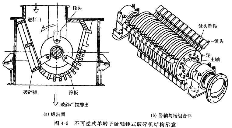 錘式破碎機(jī)包括臥軸錘式破碎機(jī)和立軸錘式破碎機(jī)兩種,常見的是臥軸錘式破碎機(jī),即水平錘式破碎機(jī)。水平軸由兩端的軸承支持,原料借助重力或用輸送機(jī)送入。轉(zhuǎn)于下方裝有篦條篩,篦條縫隙的大小決定破碎后的顆粒的大小。圖4-9所不為不可逆式單轉(zhuǎn)子臥軸錘式破碎機(jī)結(jié)構(gòu)示意。