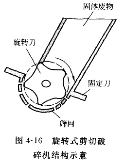 圖4-16所示為旋轉(zhuǎn)式剪切破碎機結(jié)構(gòu)示意。它內(nèi)固定刃(1-2片)和旋轉(zhuǎn)刃(3-5片)組成。固體廢物給人料斗,依靠高速轉(zhuǎn)動的旋轉(zhuǎn)刃和固定刃之間的間隙擠壓和剪切破碎,破碎產(chǎn)品經(jīng)篩縫排出機外。該機的缺點是當混人硬度較大的雜物時,易發(fā)生操作事故。這種破碎機適合家庭生活垃圾的破碎。