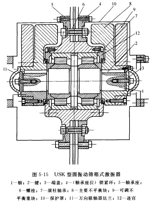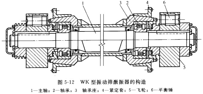 WK型圓振動篩激振器的構(gòu)造如圖5-12所示。在這種激振器中,產(chǎn)生振動的不平衡重量分別布置在軸1的中段和構(gòu)端的飛輪5上。這樣的結(jié)構(gòu),一方面可以減小軸的彎矩,同時也便改變激振器的激振力,達到調(diào)整篩于振幅的目的。鈾1用一對雙列向心球面滾子軸承裝在軸承席3上,并通過緊定套4與篩箱連接。激振器的軸承,外側(cè)采用迷宮式密封,內(nèi)側(cè)用毛氈密封,并用套筒將侗心軸封閉起來。