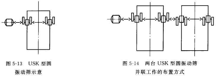 其結(jié)構(gòu)特點是,篩子的兩側(cè)各有一個激振器,兩激振器軸之間以從激振器與電動機之間都用萬向聯(lián)軸器連接。若需要的篩分面積較大時,可采取兩臺篩子并聯(lián)工作。此時,兩臺篩子之間用萬向聯(lián)軸器連接,同時將兩臺篩子的不平衡重塊相差180°安裝,如圖5-14所示。