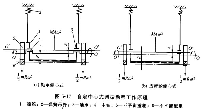 軸承偏心式自定中心圓振動篩的工作原理如圖5-17(a)所示。篩箱1用四根彈簧吊桿2吊掛在機架或樓板上,該篩于的激振器主軸4是一根偏心軸,兩端偏心部分(偏心距為r)通過軸承3與篩箱連接。侗心軸兩端安有不平衡重輪5,重輪上固定有不平衡配重6。工作時,偏心軸和皮帶輪均繞凹軸線轉(zhuǎn)動,篩箱和不平衡重輪各自產(chǎn)生離心慣性力,兩個離心慣性力的方向相反。如果根據(jù)篩箱的重量適當?shù)卮_定不平衡重量,使兩個離心力大小相等,偏心鈾的偏心距r等于篩子的振幅A,若滿足上述條件,就能使篩子在工作時的回轉(zhuǎn)軸線OO(即皮帶輪的中心線)固定不動,使篩箱在垂直平面上做圓形運動。