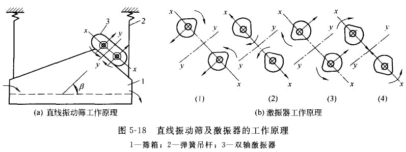 圖5-18(a)為直線(xiàn)振動(dòng)篩工作原理。圖中篩箱1用四根彈簧吊桿2懸掛在機(jī)架或橫梁上(也有采用彈簧支承在基礎(chǔ)上),雙軸激振器3安裝在篩箱上,依靠激振器,實(shí)際上是由兩個(gè)單不平衡重激振器組合而成。因此,當(dāng)兩個(gè)單八平衡重激振器的兩根軸同步異向回轉(zhuǎn)時(shí),在各瞬時(shí)位置中,兩根軸上不平衡重所產(chǎn)生的離心慣性力,沿x方向的分力總是互相抵消,而沿y方向的分力總是互相疊加。因此,形成了單一的沿y方向的激振力,依靠此力驅(qū)動(dòng)篩箱做自線(xiàn)住復(fù)振動(dòng)。如圖5-18(b)所示,當(dāng)雙不平衡重量運(yùn)轉(zhuǎn)到位置(1)和(3)時(shí),共離心力完全疊加,激振力最大;在轉(zhuǎn)到位置(2)和(4)時(shí),其離心力完全抵消,激振力為零。直線(xiàn)振動(dòng)篩一般是遠(yuǎn)離共振區(qū)工作的,這時(shí),篩箱振動(dòng)的方向和激振力的方向相反,篩箱斜向振動(dòng)時(shí),物料被斜向拋起后又落下,并進(jìn)行篩分。