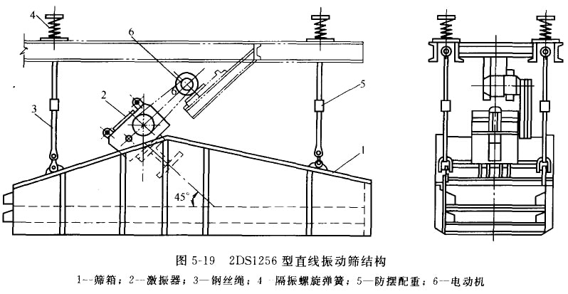 DS系列直線(xiàn)振動(dòng)篩為吊掛式振動(dòng)篩。海篩分機(jī)合中層篩面和雙層篩面兩種。圖5-19是2tDS1256型直線(xiàn)振動(dòng)篩結(jié)構(gòu)。它由雙層篩而的篩箱1、激振器2和械拄裝置組成。吊技裝置包括鋼絲繩3、隔振螺旋彈簧4和防擺配重5。傾斜裝設(shè)的激振器內(nèi)電動(dòng)機(jī)6通過(guò)皮帶傳動(dòng)系統(tǒng)帶動(dòng),產(chǎn)生與篩面成45°的激振力。篩箱在激振力的作用下,做拋射角為帖。的往復(fù)直線(xiàn)運(yùn)動(dòng)。被篩物料從給料端加入,在篩面上跳躍的前進(jìn);篩下產(chǎn)物自下部排出,收集在篩下漏斗中;篩上產(chǎn)物從排料端排出。