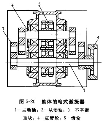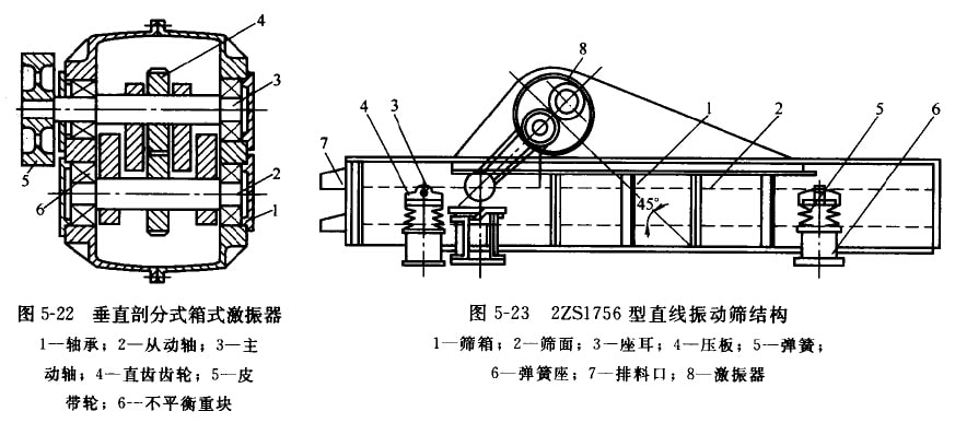 DS系列直線(xiàn)振動(dòng)篩采用整體的箱式激振器(見(jiàn)圖5-20)。激振器的箱體用35號(hào)鑄俐制成。箱體內(nèi)槳有主動(dòng)軸1和從動(dòng)軸2,軸上各有一對(duì)重 量相向的不平衡員塊(偏心塊)3,皮帶輪4帶動(dòng)土軸問(wèn)轉(zhuǎn),通過(guò)一對(duì)齒輪5使從動(dòng)軸做反向心同歲的回轉(zhuǎn),利用個(gè)平衡玉回轉(zhuǎn)時(shí)產(chǎn)生的離 心力使激振器產(chǎn)牛定向的激扼力。該激振器具有以下結(jié)構(gòu)特點(diǎn)。①平衡重塊成對(duì)地布量在激銀器箱體外面。這樣可使箱內(nèi)結(jié)構(gòu)緊湊;便 于調(diào)整不平衡重塊上面的配重柱塞,以改變篩稻的振幅;同時(shí),也避免不平衡重塊回轉(zhuǎn)時(shí),碰擊箱體內(nèi)的潤(rùn)滑油而引起箱體發(fā)熱。齒輪 對(duì)安裝在箱體內(nèi),使其潤(rùn)滑可靠,傳動(dòng)平穩(wěn)。②制成整體式,沒(méi)有別分面,在承受激振力時(shí)較合理,制造簡(jiǎn)單,但拆裝困難。