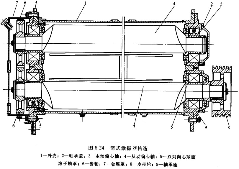 座式直線(xiàn)振動(dòng)篩采用筒式激振器,其構(gòu)造如圖5-24所示。在帶三角形側(cè)板的扁圓筒形外殼1上裝有軸承座9,兩根偏心軸3、4通過(guò)一對(duì)雙列向心球面滾子軸承5安裝在軸承座上。皮帶輪8帶動(dòng)主動(dòng)偏心軸3并經(jīng)一對(duì)齒輪6使從動(dòng)偏心軸4做反向同步回轉(zhuǎn),從而產(chǎn)生定向的激振力。在一對(duì)齒輪6一側(cè)有金屬罩7,內(nèi)裝潤(rùn)滑油,用以潤(rùn)滑齒輪和同側(cè)的該動(dòng)軸承。皮帶輪側(cè)的軸承各成封閉油腔,采用潤(rùn)滑脂潤(rùn)滑。齒輪側(cè)的波動(dòng)軸承和皮帶輪側(cè)的滾動(dòng)軸承采用迷宮式密封。激振器通過(guò)螺栓固定在篩箱上,并用鉸孔螺栓定位。