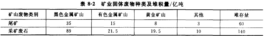 據(jù)統(tǒng)計(jì),我國(guó)礦業(yè)廢物的堆存望已達(dá)200余億噸(表8-2),占我國(guó)工業(yè)固體廢物堆積量的85%以上,并以2-3億噸的速度逐年增長(zhǎng)。目前年排放尾礦約5億噸、采礦廢人4億噸、煤殲石1.5億噸、赤泥500萬(wàn)噸、冶煉渣450萬(wàn)噸。這些礦業(yè)廢物苦處理、處置不當(dāng),不僅侵占土地,給生態(tài)環(huán)境和人身健康造成嚴(yán)重危害,還格加劇排L場(chǎng)滑坡、泥石流、尾礦庫(kù)潰壩等工程災(zāi)害,浪費(fèi)有價(jià)資源,污染周圍水體、土壤和大氣,破壞生態(tài)植被、導(dǎo)致土地退化及沙漠化等一系列問(wèn)題。