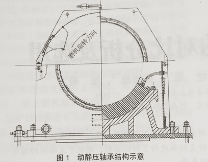 最初磨機(jī)規(guī)格較小時(shí),基本上都是用此類(lèi)主軸承。其工作原理是,磨機(jī)還沒(méi)運(yùn)轉(zhuǎn)時(shí),先啟動(dòng)潤(rùn)滑站的高壓泵,高壓油進(jìn)入到主軸承的油腔中頂起中空軸,在軸承和中空軸之間形成一層油膜,當(dāng)磨機(jī)筒體開(kāi)始旋轉(zhuǎn)時(shí),利用軸承的楔形油腔產(chǎn)生的動(dòng)壓效應(yīng),在軸承和中空軸之間形成一層穩(wěn)定的油膜,同時(shí)潤(rùn)滑站的高壓系統(tǒng)停止供油,低壓系統(tǒng)向主軸承的頂部供 低壓油,低壓油灑在旋轉(zhuǎn)的中空軸上,對(duì)已經(jīng)形成的油膜進(jìn)行油量補(bǔ)充。動(dòng)靜壓軸承的結(jié)構(gòu)如圖1所示。