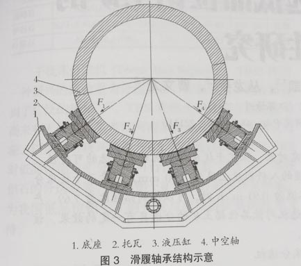 圖3可以看出,整體軸承分解為數(shù)個(gè)單獨(dú)的滑履,支撐在球磨機(jī)通體的滑環(huán)上。大型球磨機(jī)采用這個(gè)結(jié)構(gòu),在縮短2個(gè)軸承的間距,改善筒體受力狀態(tài),進(jìn)出料口尺寸不受軸頸限制,但結(jié)構(gòu)復(fù)雜,成本較高,同時(shí)其調(diào)試比較麻煩。