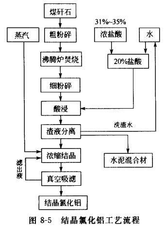 結(jié)晶氯化鋁的制各工藝為:按配比稱取一定量的經(jīng)焙燒、粉碎后的煤酐石和20%的鹽酸溶液,加入反應(yīng)釜中,在一定條件下反應(yīng)后,加入含量15%的聚丙烯酷胺凝聚劑進(jìn)行沉陷,真空抽濾,母液濃縮得結(jié)晶氯化鋁租品,進(jìn)一步精制即得到含三氮化鋁98.9%的一級品。其工藝流程如圖8-5所示。