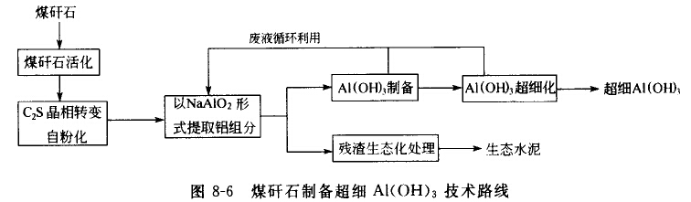 呂淑珍等采用礦物組成改性技術(shù)活化煤肝心中的Al2O3,消除阻止C2S晶相轉(zhuǎn)變的干擾因素,實(shí)現(xiàn)了煤矸石活化燒結(jié)料100%的自粉化,自粉化料平均粒徑小于1μm;用8%碳酸鈉溶液可從白粉化料中以NaAlO2的形式提取鋁組分,用高效分散-炭化法制備超細(xì)Al(OH)3,工藝流程如圖8-6所示,其平均粒度小于200nm,為煤矸石的高價(jià)值利用開辟了一條新的途徑。