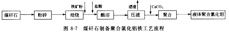 用煤矸石制備聚合氰化鋁鐵主要是利用煤矸石中的Al2O3、Fe2O3(Fe2O3含量低時(shí)需外加一定量的鐵礦石)與鹽酸反應(yīng)生成AlCl3和FeCl3,然后再通過聚合反應(yīng)制取聚合氯化鋁鐵,其工藝流程如圖8-7所示。