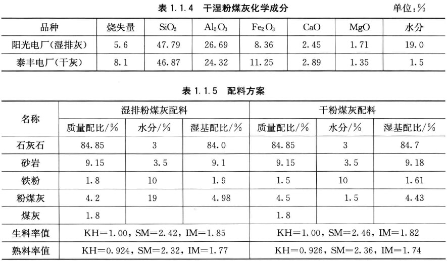 (1)粉煤灰成分。選用泰豐電廠的于粉煤灰,干濕粉煤灰的化學(xué)成分見表1.1.4,干灰的A1203含量低、Fe2O3含量高,配比中通過降低鐵粉的配比,控制砂巖使用量,適當(dāng)增加干灰的用量。